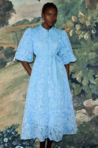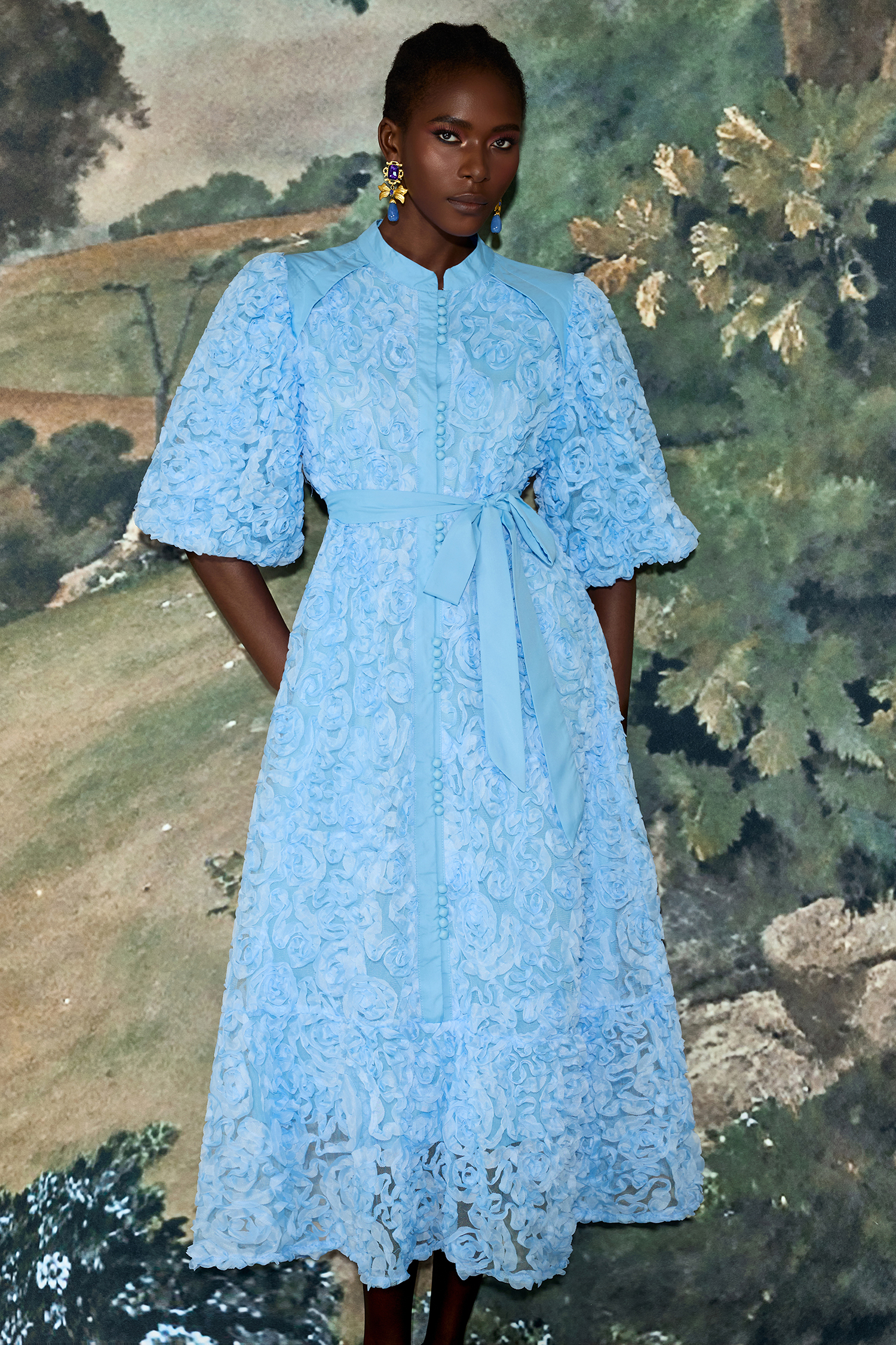 - Short sleeve, solid color, blue, 3D flower, midi dress