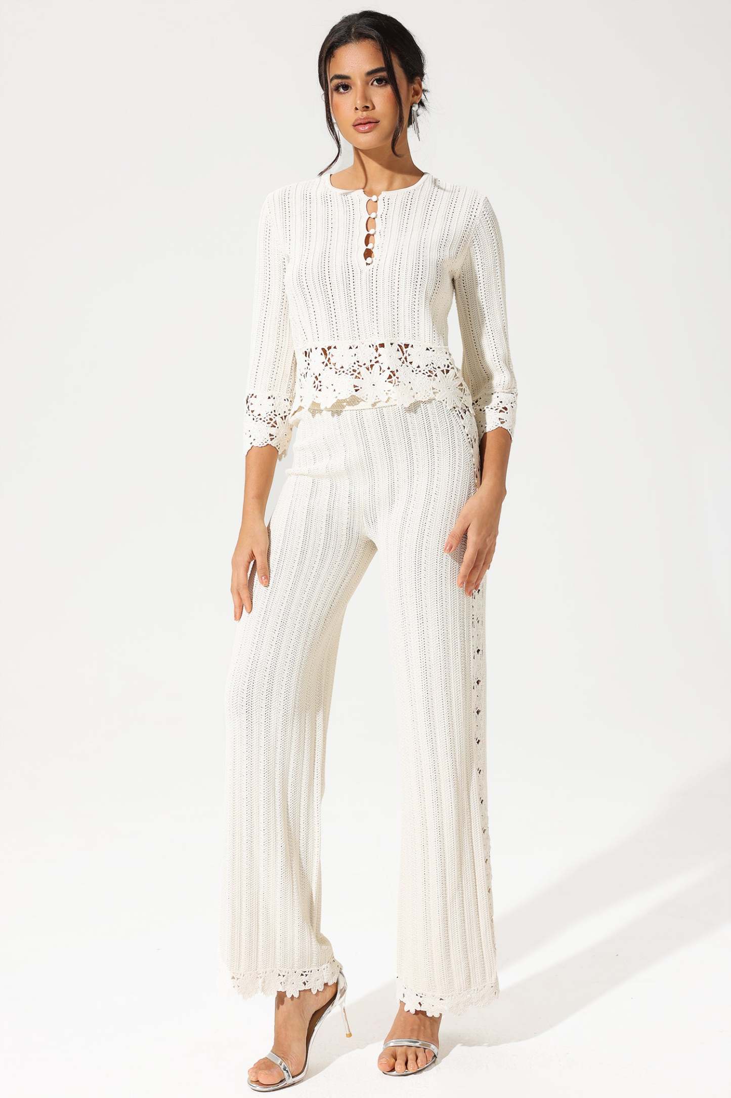 - Crew collar, cut-out, lace hem, knit, suit
