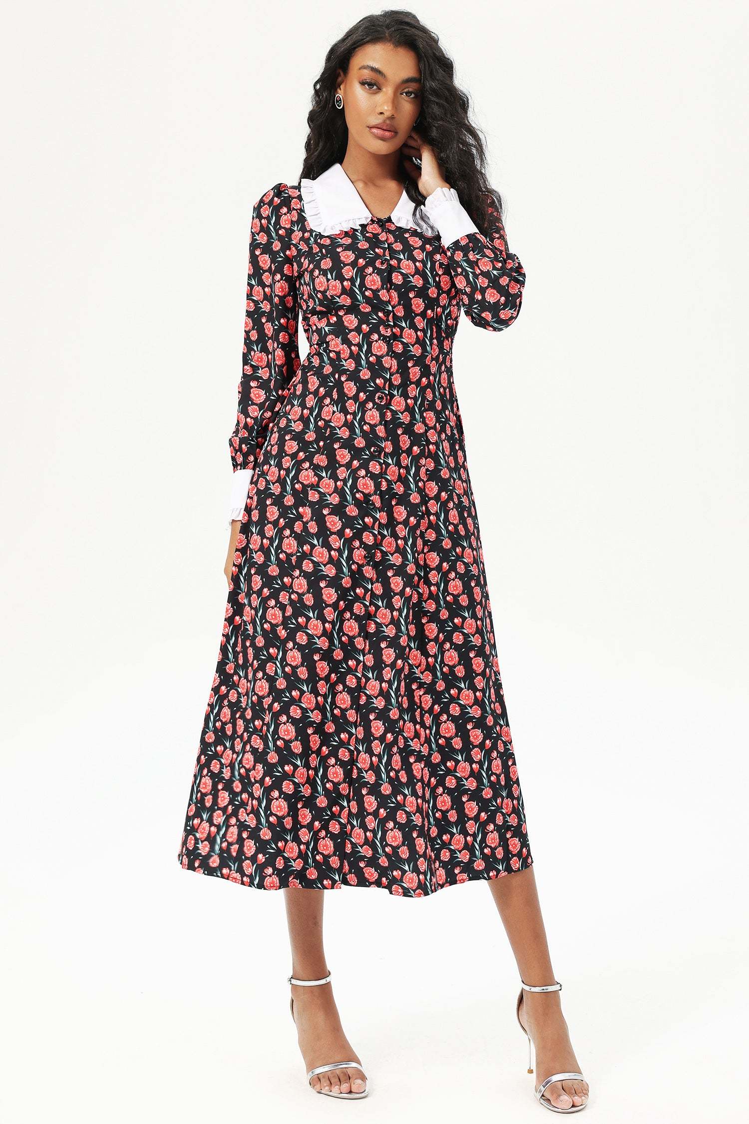 - Floral, long sleeve, peter pan-collar, buttoned, midi dress