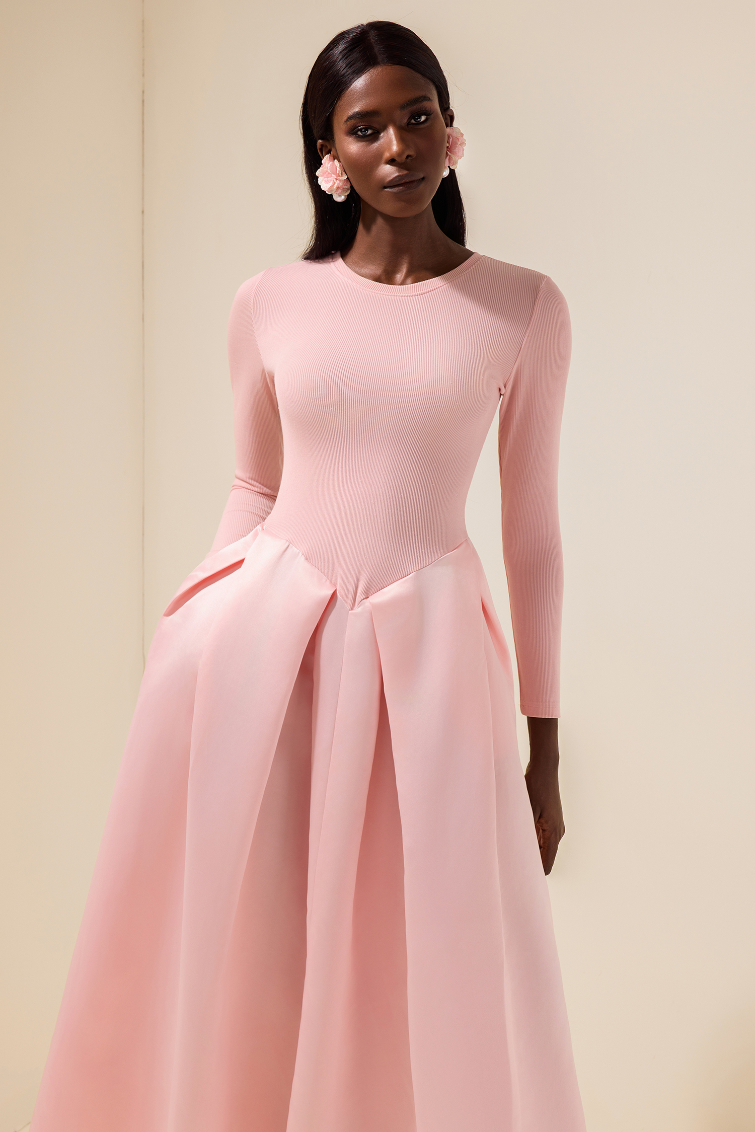 • Long sleeve, solid color, pink, midi dress