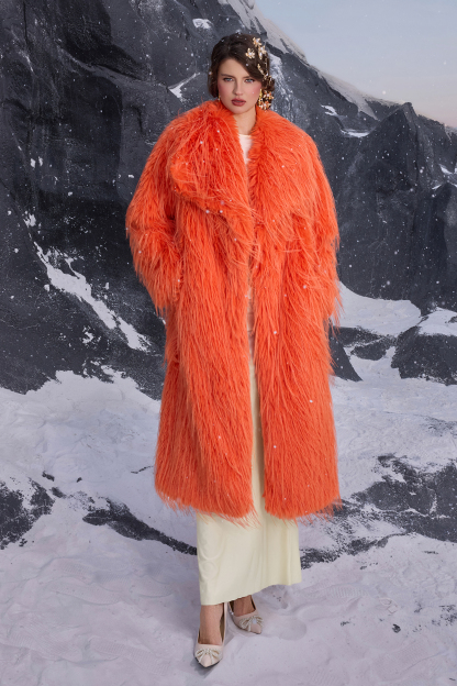• Long sleeve, solid color, orange, tassel, faux fur fabric, coat